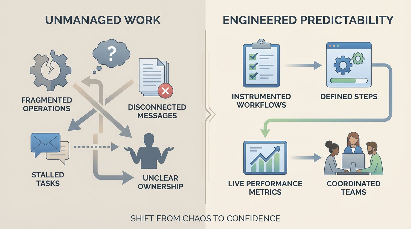 The result is fragile processes, inconsistent outcomes, and burned-out teams that can't scale. When execution depends on heroics, failure becomes inevitable.